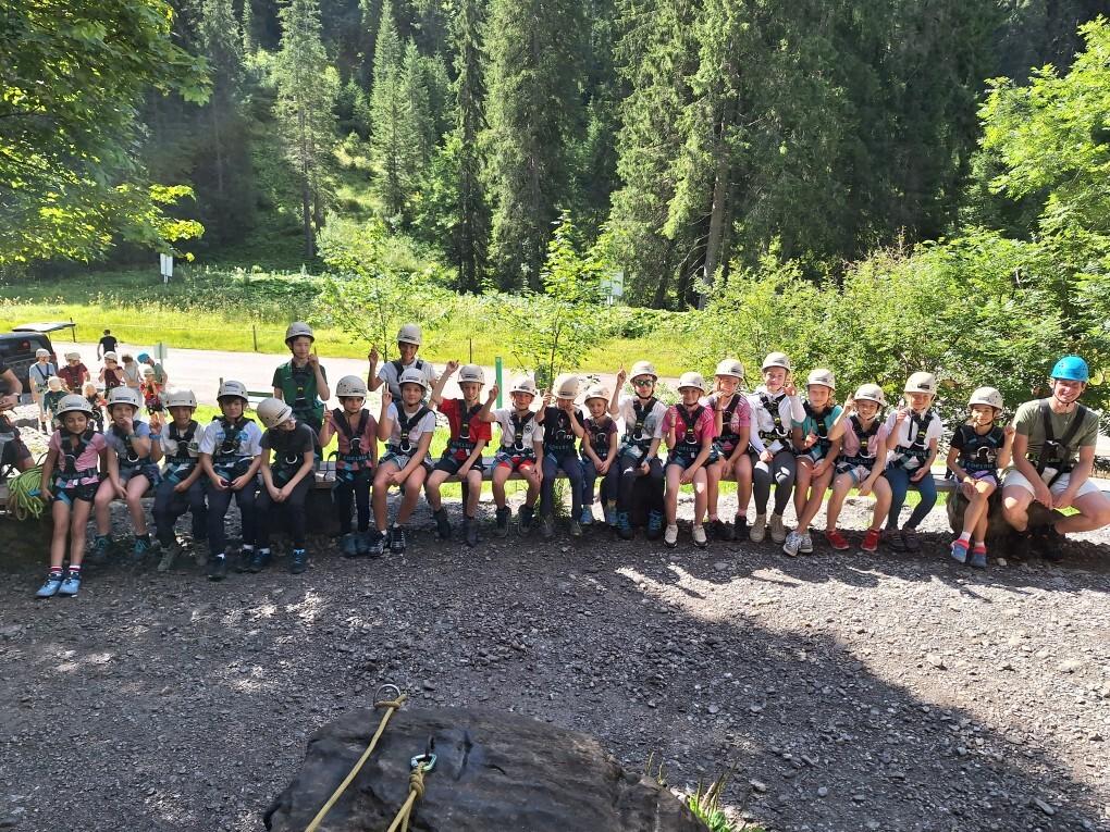 Gruppe von Kindern und Betreuern in Kletterausrüstung und Helmen, sitzend in der Natur.