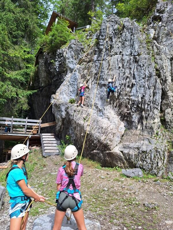 Drei Kinder in Kletterausrüstung sichern zwei Kletterer an einer steilen Felswand im Wald.