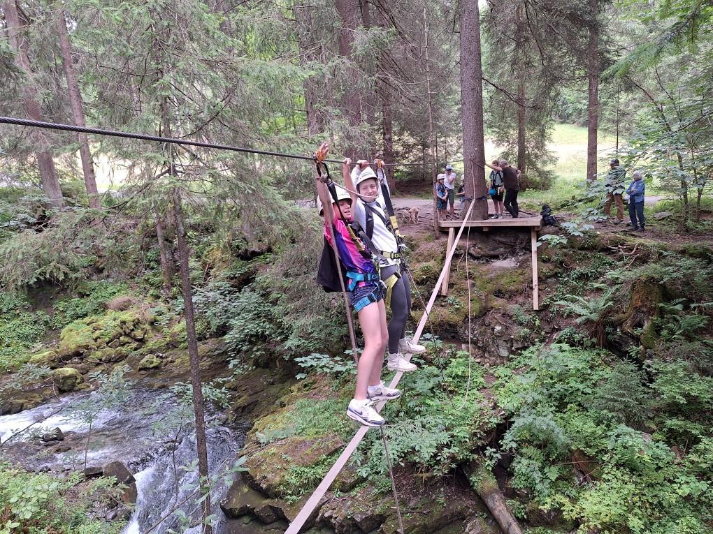 Zwei Personen stehen auf einer Seilbrücke zwischen Bäumen über einem Bach, im Hintergrund weitere Personen und Natur.