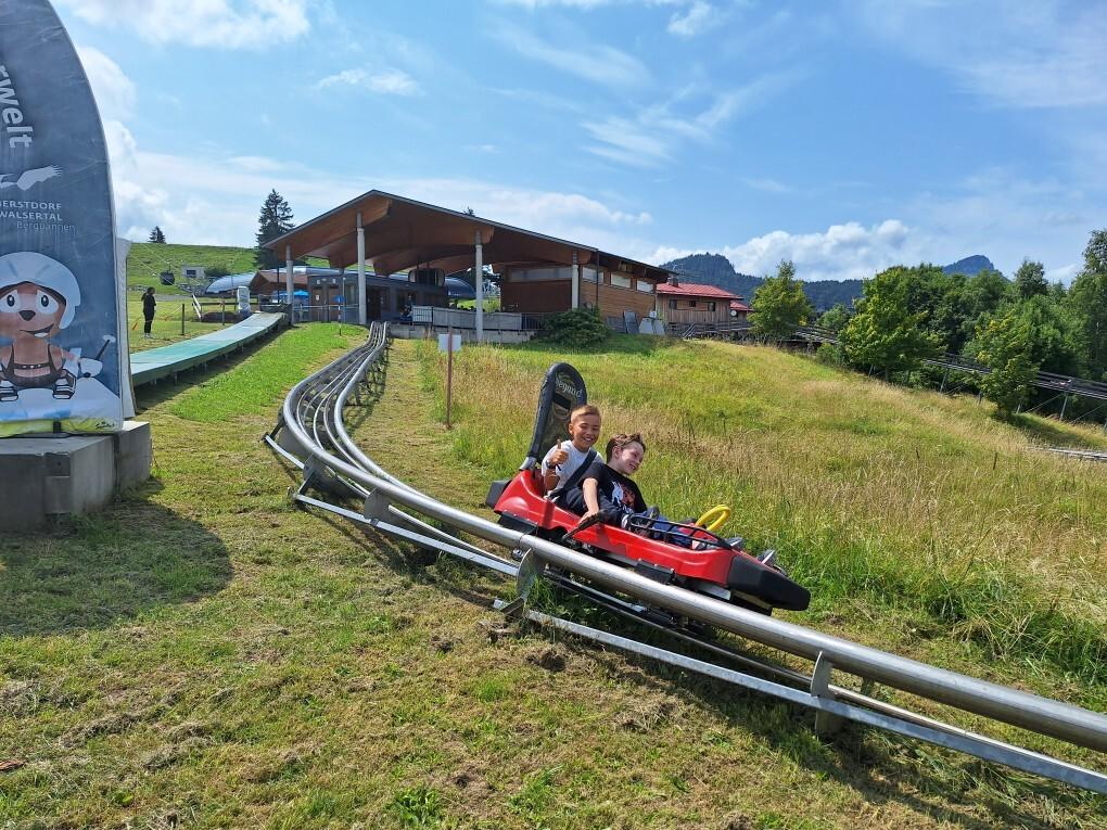 Zwei Kinder sitzen in einer roten Sommerrodelbahn, während die Strecke durch eine grüne Wiese verläuft.