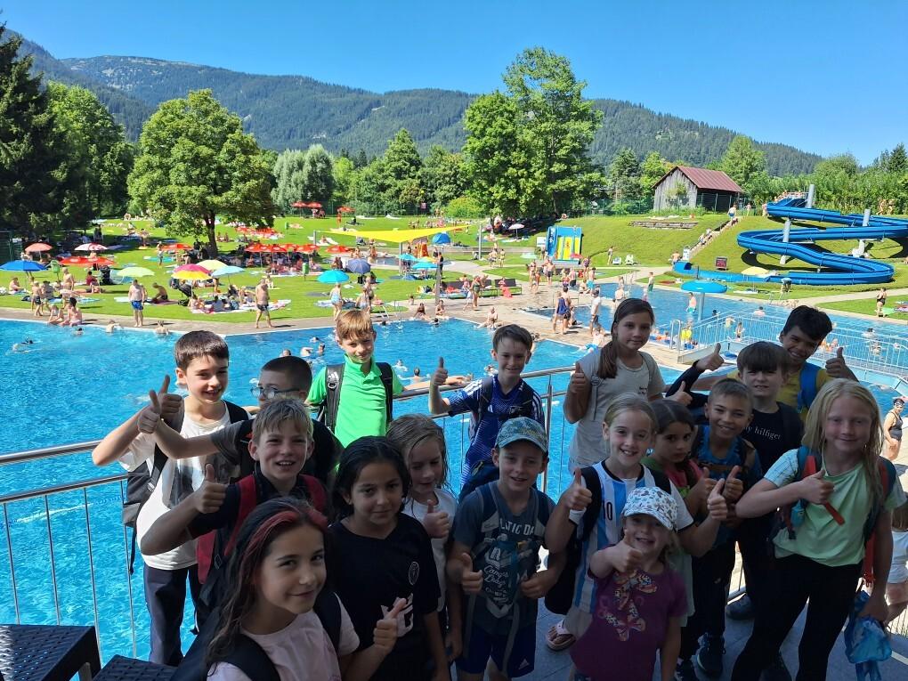 Gruppe von Kindern mit Rucksäcken am Rand eines Schwimmbads, im Hintergrund sind Rutschen und sonnige Wiesen.