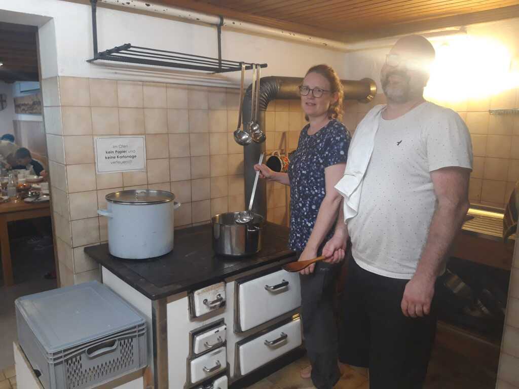 Zwei Personen in einer Küche stehen an einem Herd mit einem Topf und einer Kelle in der Hand.
