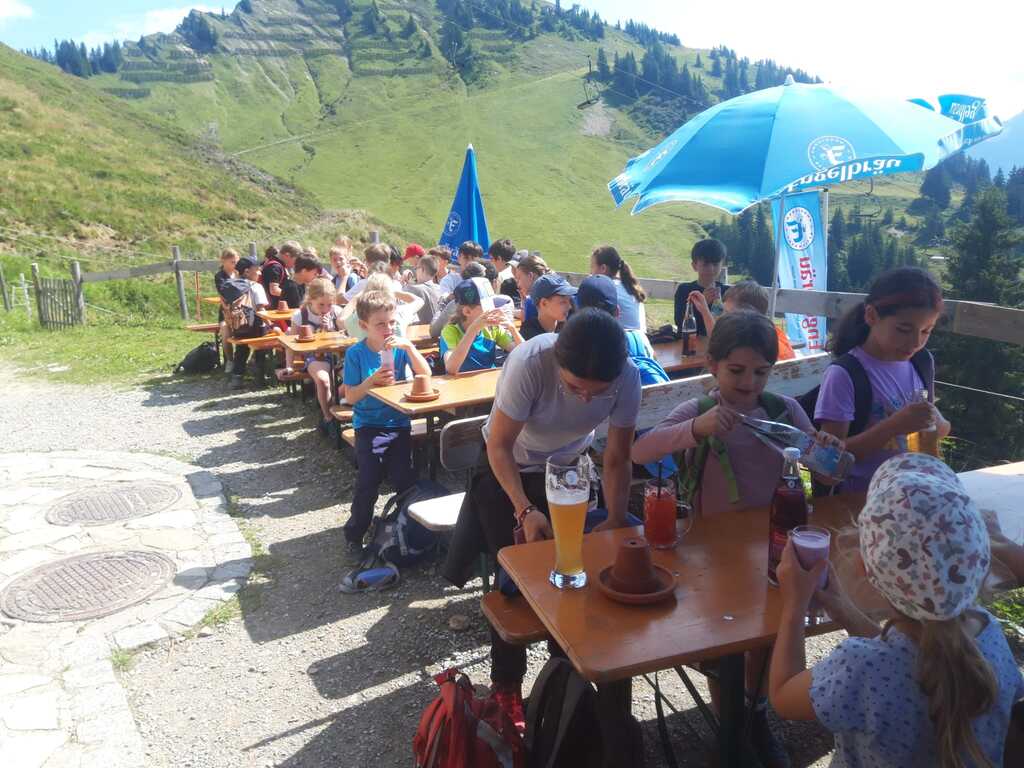 Gruppe von Kindern und Jugendlichen sitzt an Tischen im Freien, mit Blick auf eine grüne Berglandschaft.