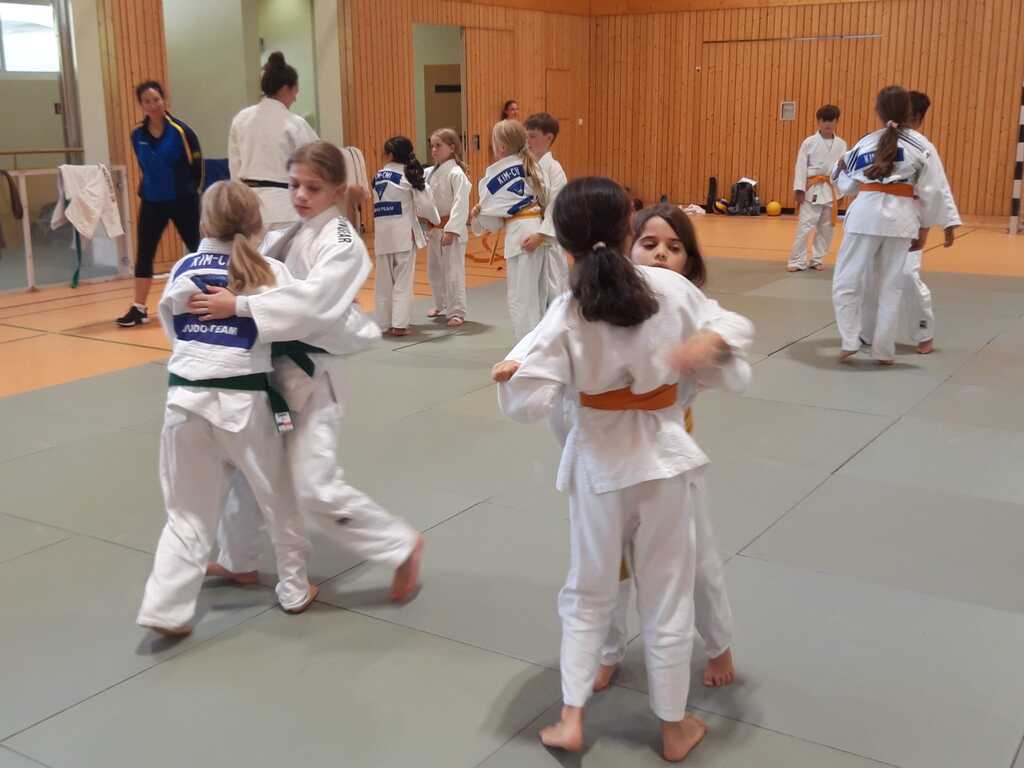 Gruppentraining von Kindern in Judoanzügen, die in einem Sportraum an Techniken üben.