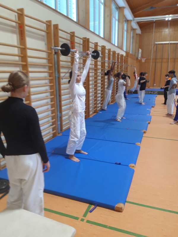 Gruppentraining in einer Sporthalle: Jugendliche heben Gewichte auf blauen Matten, während Trainerin beobachtet.