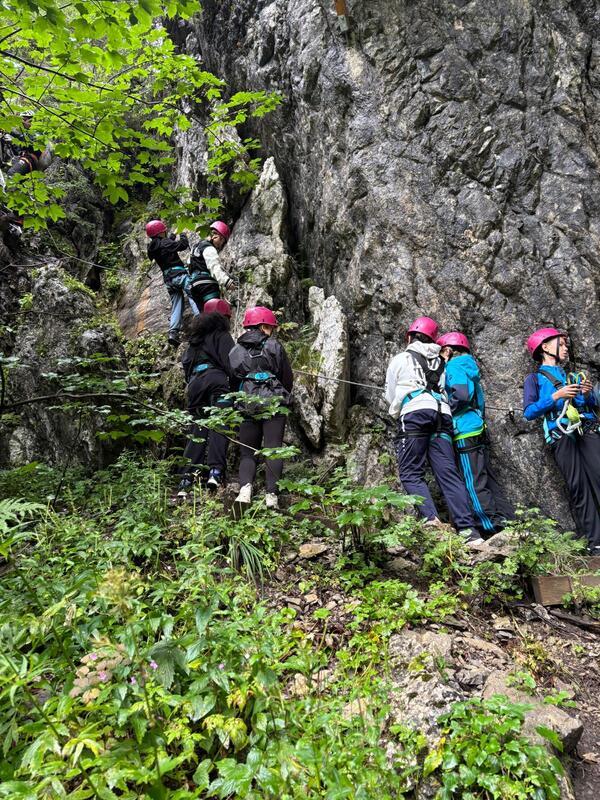 Gruppe von Kletterern mit Helmen folgt einer Felswand in einem bewaldeten Gebiet.
