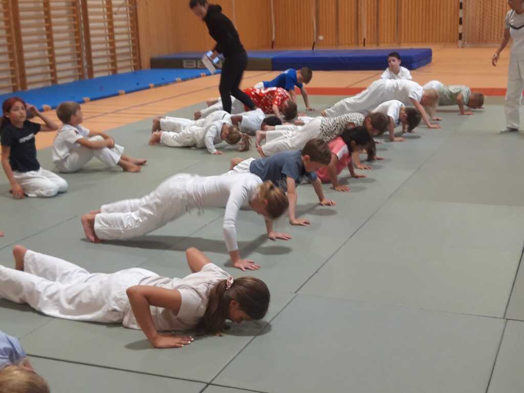 Gruppe von Kindern in weißen Trainingsanzügen macht Liegestütze auf einer Tatami-Matte in einer Sporthalle.