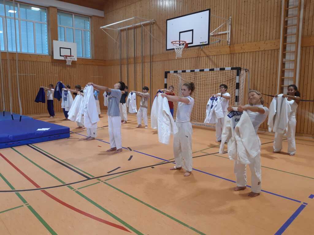 Gruppe von Kindern in Sportkleidung übt mit weißen Judo-Anzügen in einer Sporthalle.