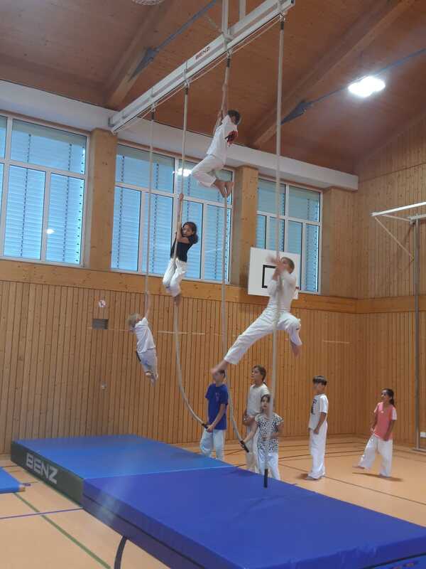Mehrere Kinder üben in einer Turnhalle an Reifen und einer Matte, einige hängen, während andere zusehen.