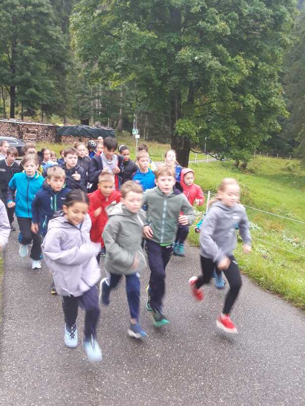 Eine Gruppe von Kindern in Sportkleidung läuft auf einem Weg durch eine waldreiche Umgebung.